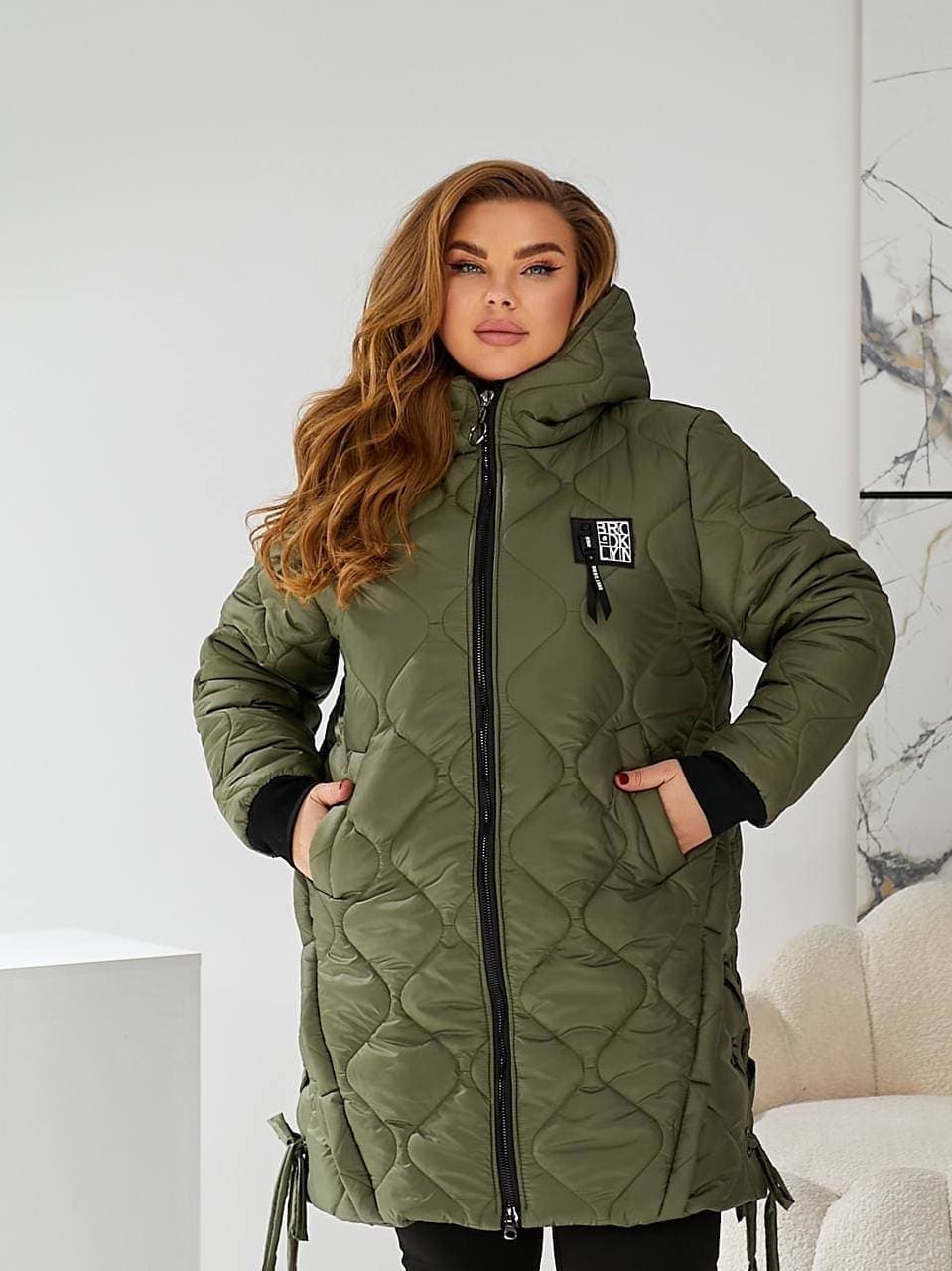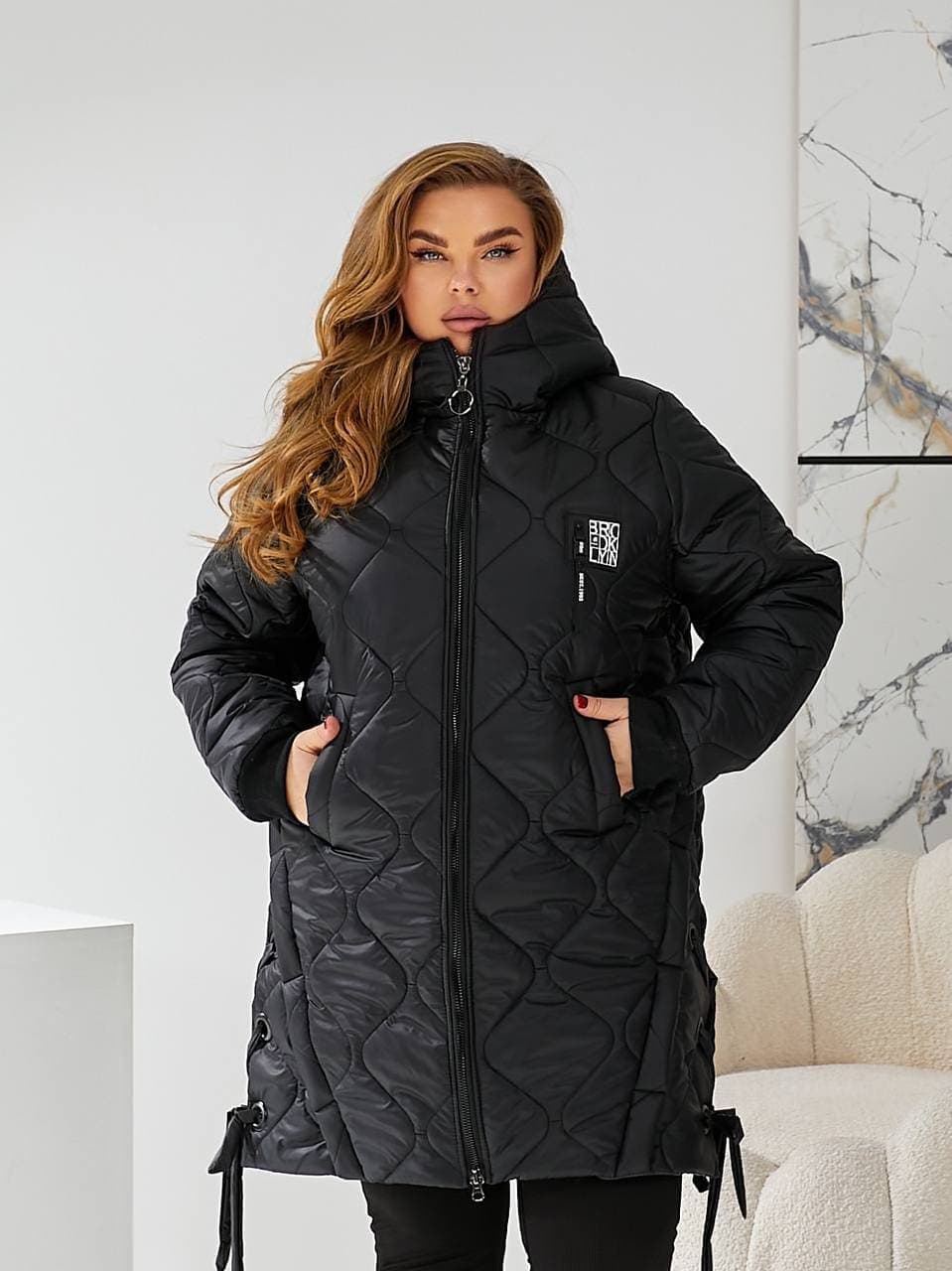 Стильна стьобана куртка цікавого крою із зав'язками з боків, глибокий зручний капюшон, кишені, манжети.