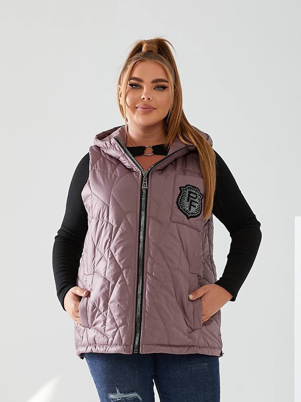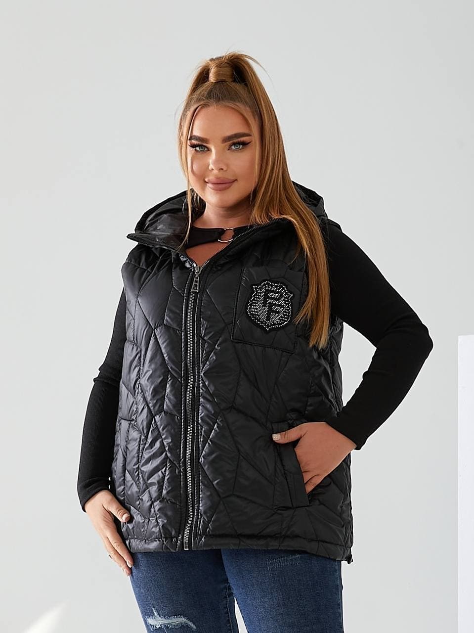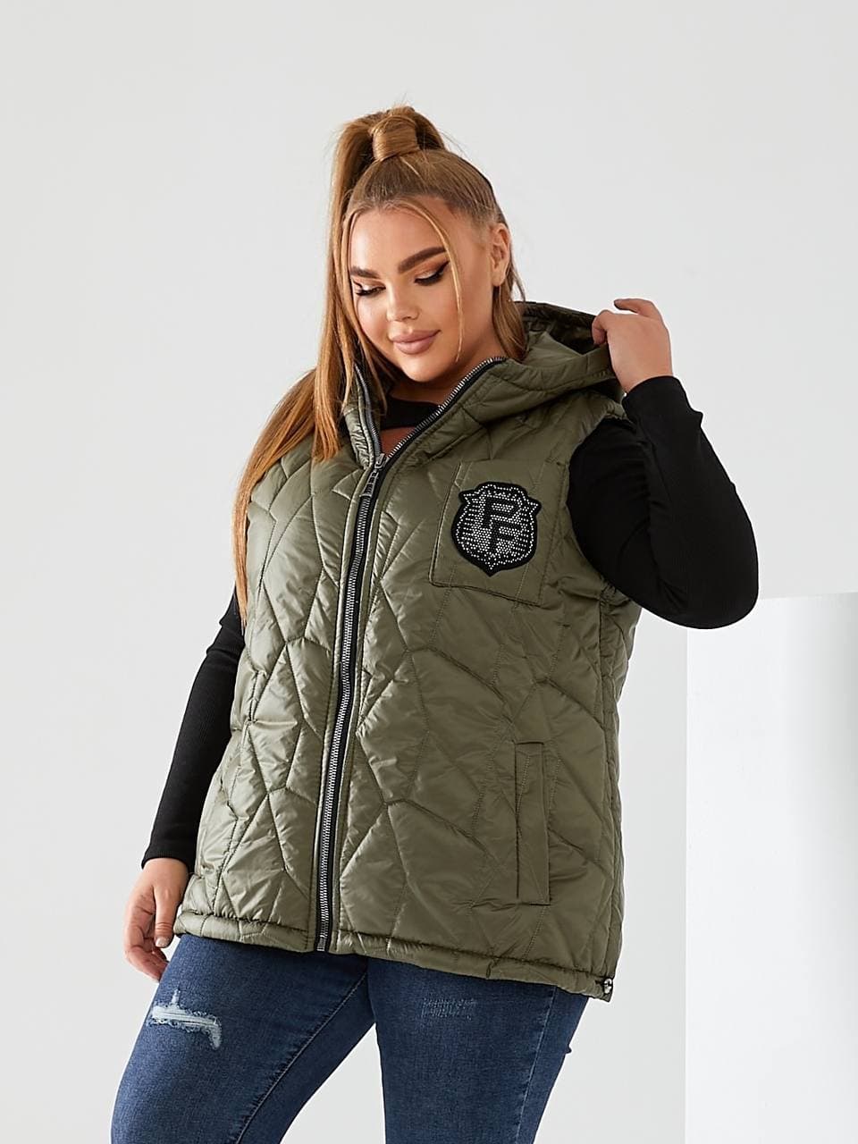 Стильний стьобаний жилет з кишенями, зручний глибокий капюшон, декорована нашивкою з камінням, якісна фурнітура.