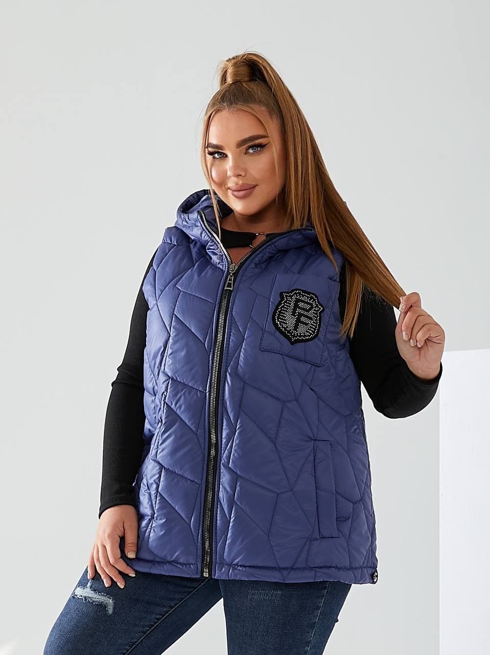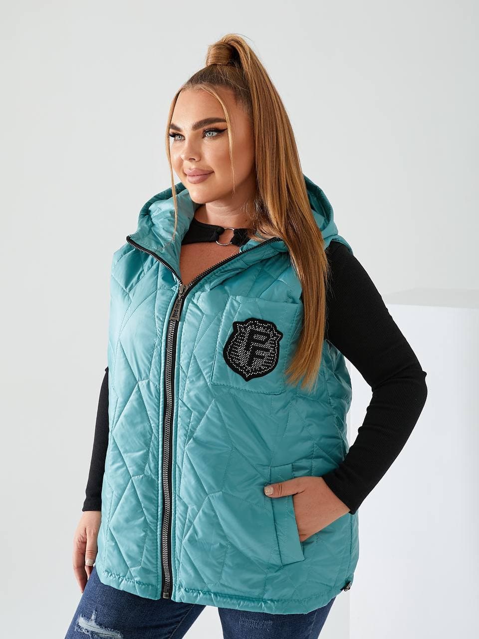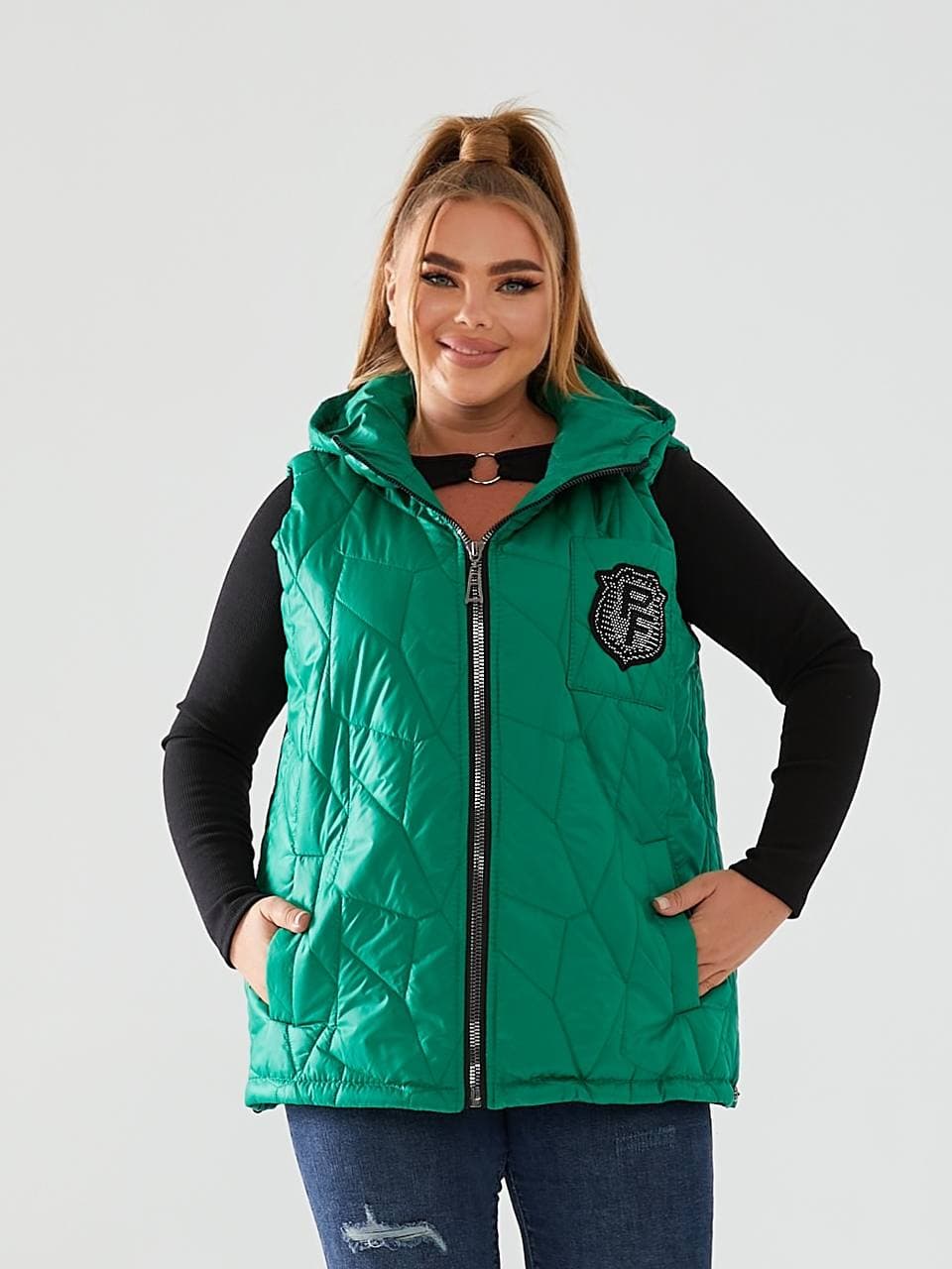 Стильний стьобаний жилет з кишенями, зручний глибокий капюшон, декорована нашивкою з камінням, якісна фурнітура.
