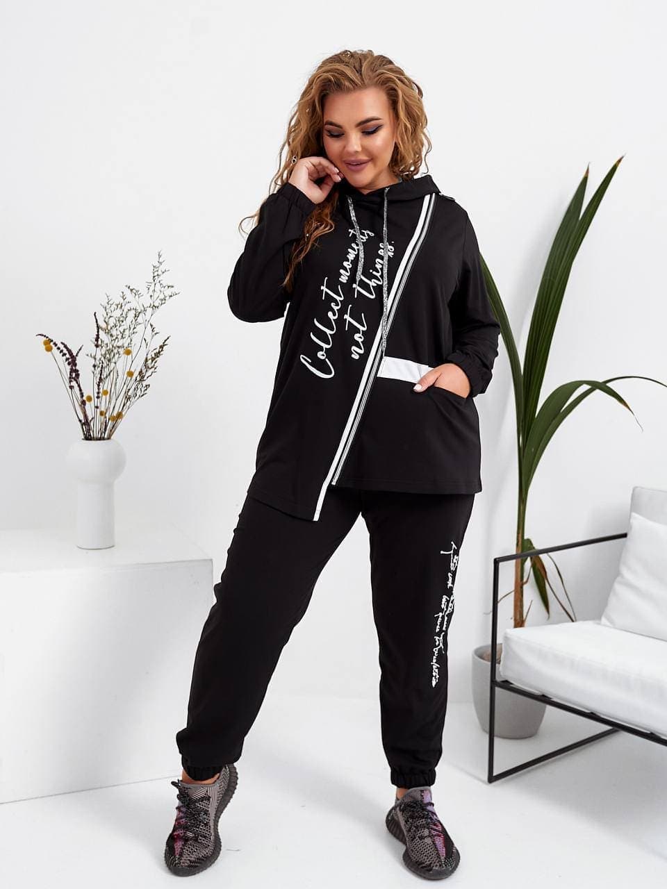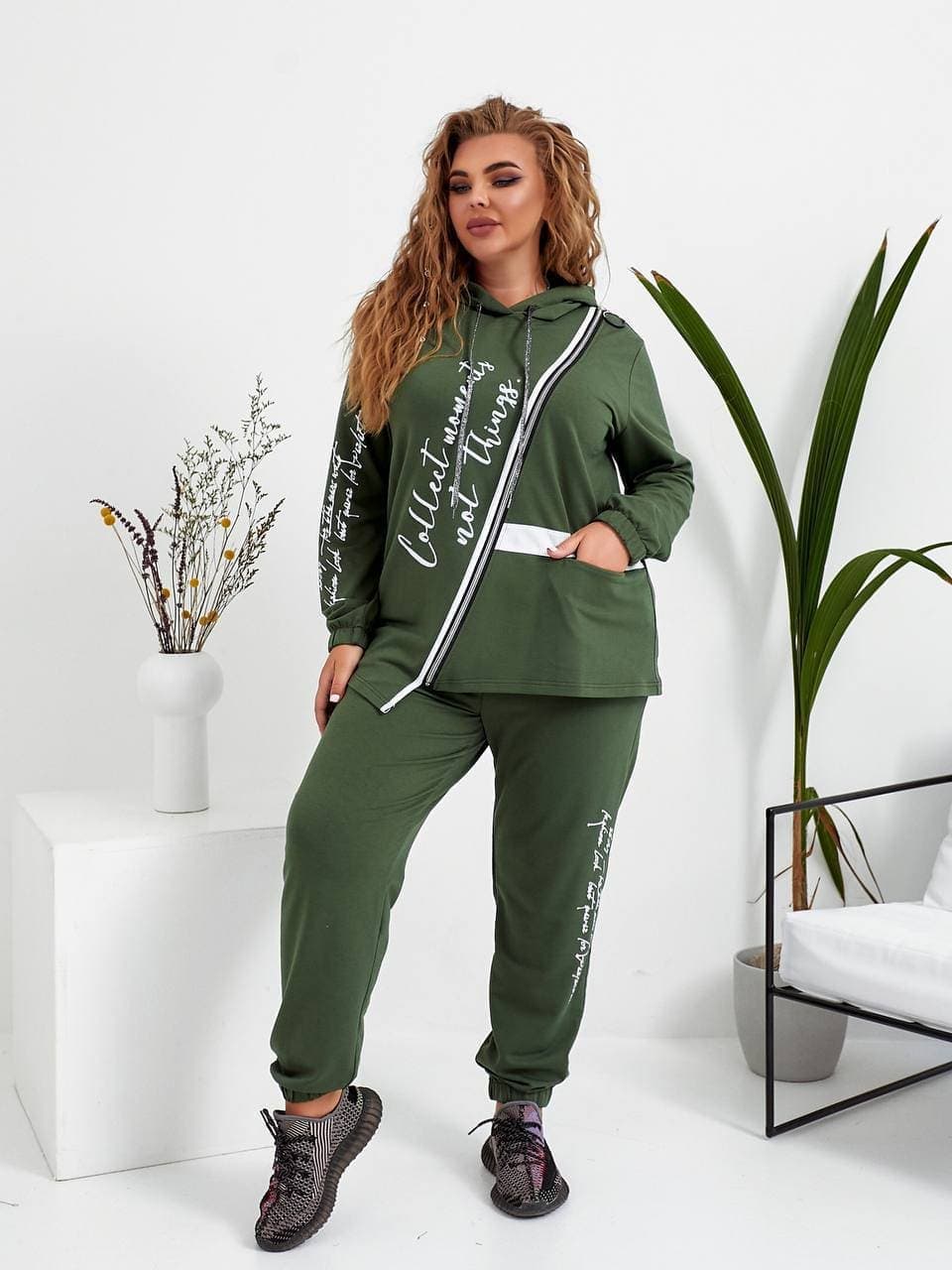 Спортивний костюм з подовженою кофтою. Накладні кишені з декорованого змійкою. Штани на гумці вільного силуету, на манжеті внизу, по бічних швах декоровані лампаси.