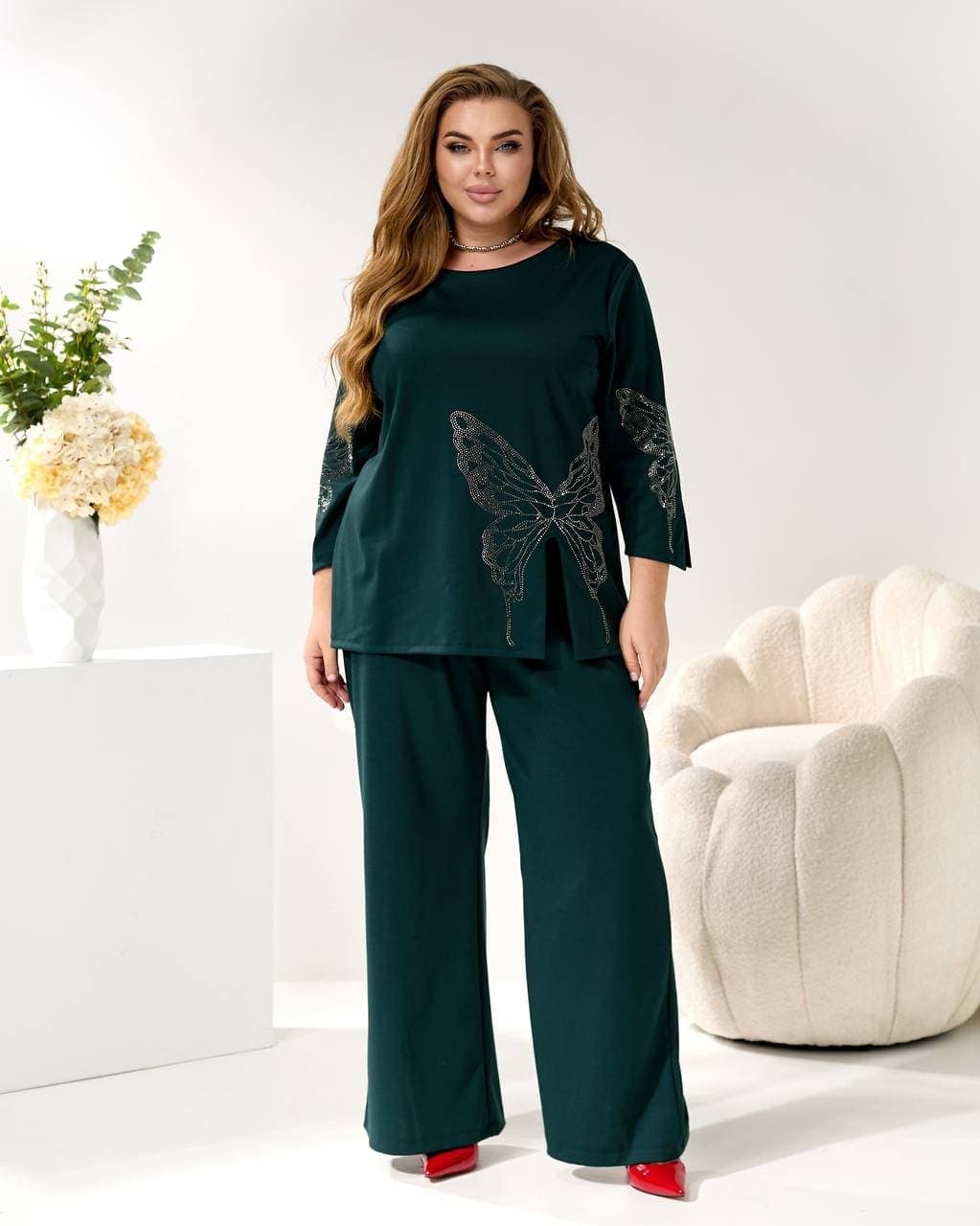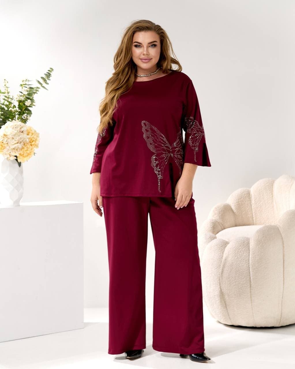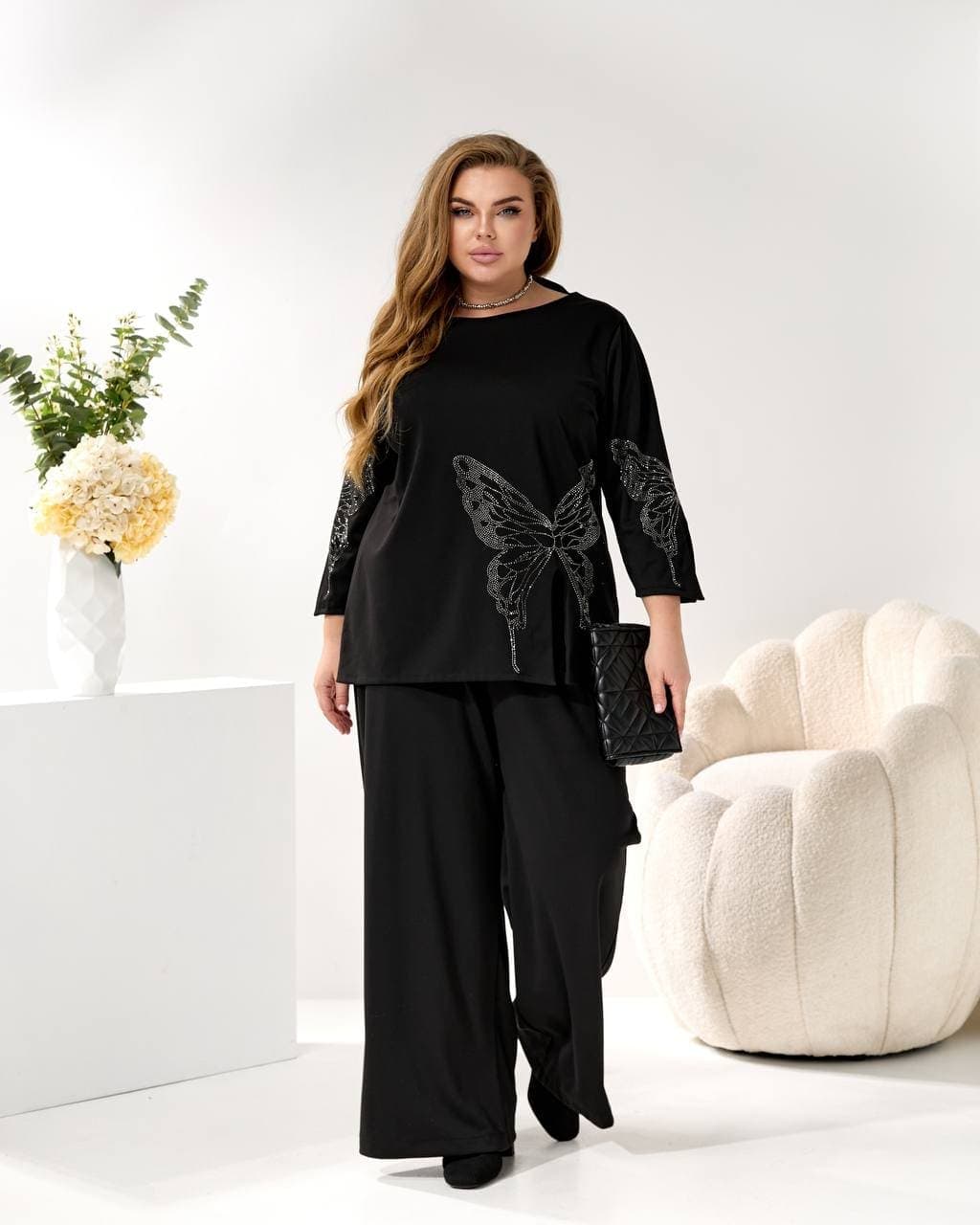 Цей вишуканий брючний костюм, що складається з туніки та штанів палаццо, створений для того, щоб підкреслити вашу жіночність та почуття стилю!
