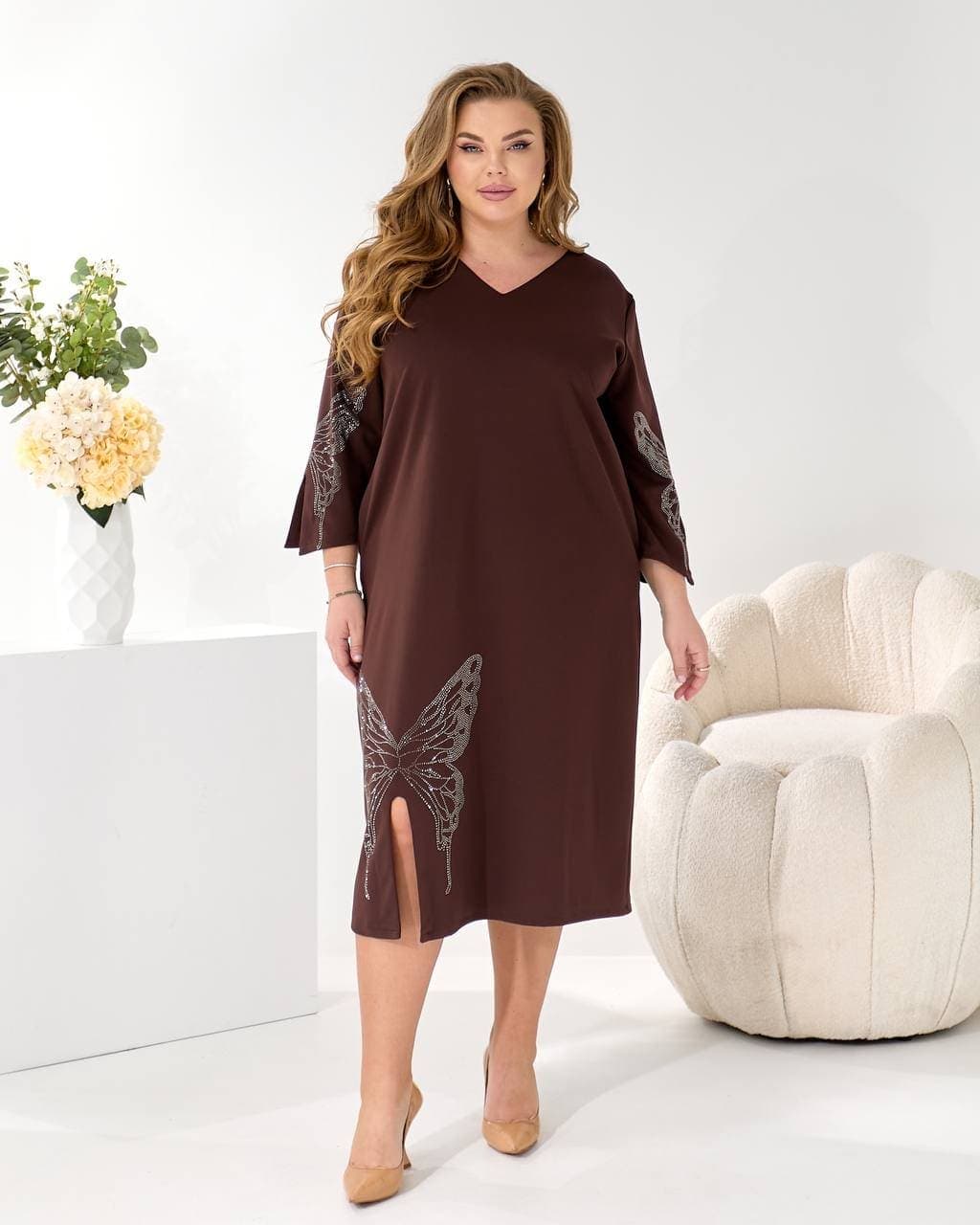 Елегантна сукня міді, виконана у вільному, прямому крої з V-подібним вирізом, що гарантує ідеальну посадку на будь-яку фігуру.